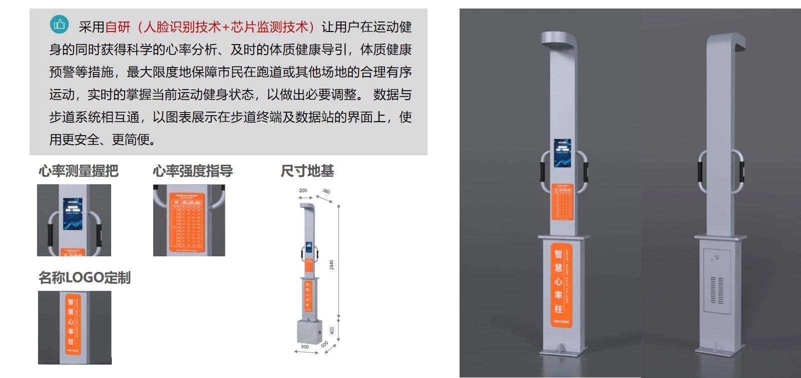 对步道上的注册用户包含健身、锻炼、赛事等数据和人流量进行实时的数据采集,科学的流量分析、有效的人员运动指导策略、并上传至云端大数据中心分析,及时的人员导引信息发布等措施,最大限度地保障步道已注册的用户人员在步道或园内的合理有序运动,并以数据统计的图表显示在步道大屏上。另可满足马拉松、路跑、骑行、轮滑、铁三、赛车等各种专业级赛事运动场景。同时该设备集成SOS一键智能报警功能。