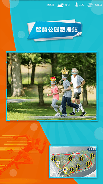 采用户外工业级材质,长期使用﹐稳定可靠,界面展示信息丰富,如运动排名、运动时长分布、步道流量、个人运动数据等多样数据展示,通过专业配套的数据采集通讯技术,对步道或公园内的风速风向、雨量、空气温度、空气、湿度等气象要素进行全天候现场监测实时反馈给锻炼者天气情况,户外运动适宜指数等。