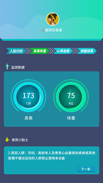 对步道或公园的游客进行体质数据收集,此产品用于公园、景区、校区锻炼场地、操场跑道等多处场景,可以快速检测出自身心率、身高、体重、血压、精神评估等实时报表数据,随时随地掌握当前运动健身状态,科学的心率分析监测、有效的人员导引策略、及时的学生体质健康的导引,做出必要调整,并以数据统计的图表显示在步道大屏上。